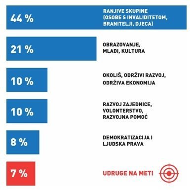 Od ukupnog proračuna Nacionalne zaklade 44 posto sredstava namijenjeno je za ranjive skupine (osobe s invaliditetom, branitelje, djecu), 21 posto za udruge koje se bave obrazovanjem, mladima i kulturom, 10 posto za one koje skrbe o okolišu, održivom razvoju i održivoj ekonomiji, te isto toliko za udruge koje promiču razvoj zajednice, volonterstvo i razvojnu pomoć.