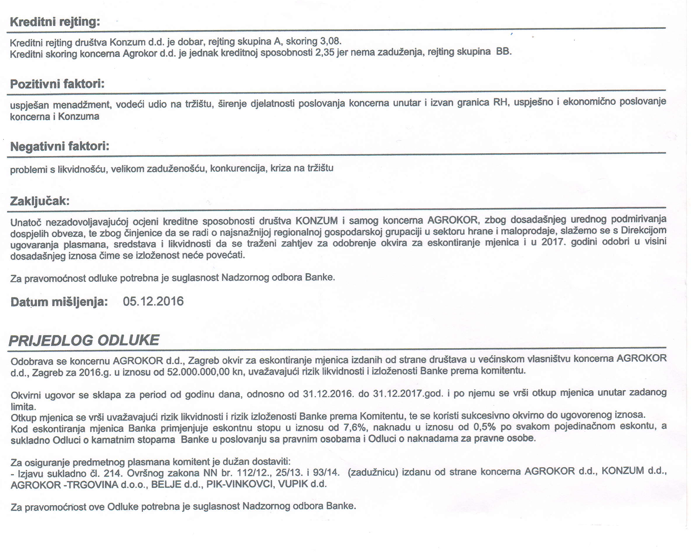 U prijedlogu odluke JABA-e se također kaže: Otkup mjenica se vrši uvažavajući rizik likvidnosti i rizik izloženosti Banke prema Komitentu… Dakle, ma koliko stanje u Agrokoru bilo teško, što je bilo poznato i sanacijskoj upravi JABA-e, nekmoli ministru financija Zdravku Mariću, kompaniji se usluga ne može odbiti. Ipak je riječ o Gazdi…