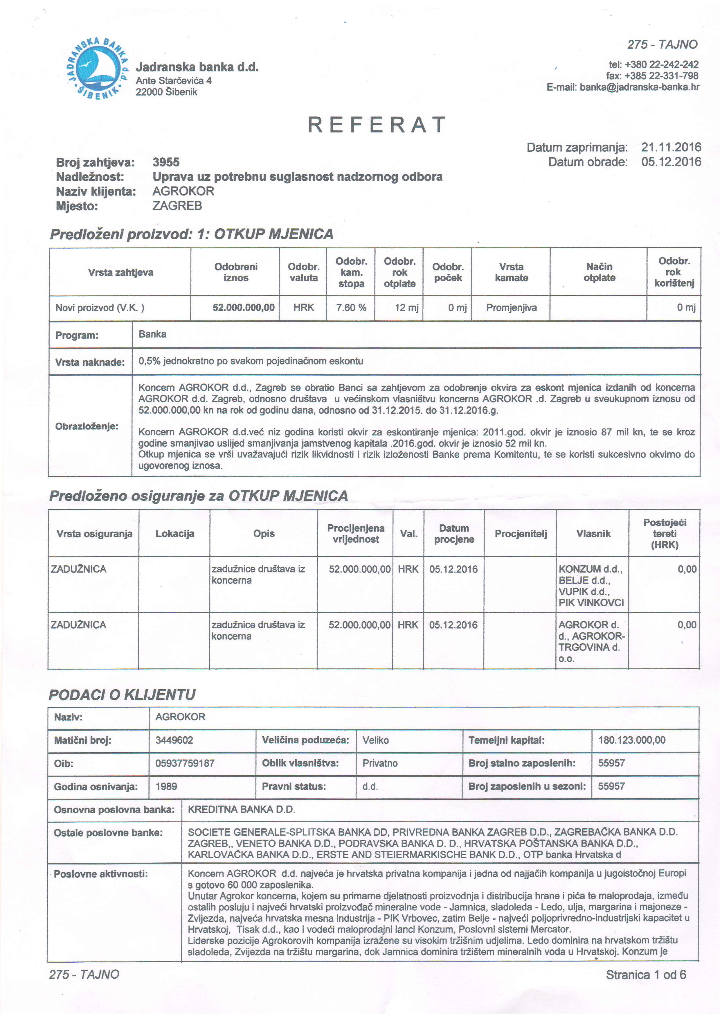 O novom aranžmanu s Agrokorom svjedoči dokument s oznakom „tajno“ koji je procurio iz Banke, a iz kojega je vidljivo da sanacijska uprava prihvaća kao osiguranje zadužnice Konzuma, Belja, Vupika i PIK-a Vinkovci, odnosno Agrokor-trgovine d.o.o., besumnje nenaplative s obzirom na krah prezadužene kompanije. Dokument, čiji faksimil objavljujemo, pokazuje i da je odluka JABA-e donesena pri punoj svijesti o stanju u koncernu. Pa tako u zaključku stoji:“Unatoč nezadovoljavajućoj ocjeni kreditne sposobnosti društva Konzum i samog koncerna Agrokor, zbog dosadašnjeg urednog podmirivanja dospjelih obveza, te zbog činjenice da se radi o najsnažnijoj regionalnoj gospodarskoj grupaciji u sektoru hrane i maloprodaje, slažemo se s Direkcijom ugovaranja plasmana, sredstava i likvidnosti da se traženi zahtjev za odobrenje okvira za eskontiranje mjenica i u 2017. godini odobri u visini dosadašnjeg iznosa, čime se izloženost neće povećati“.
