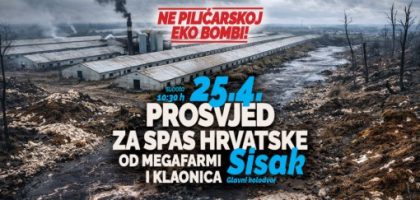Zelena akcija, Prijatelji životinja, Siščani ne žele biti Smetlišćani i dvanaest građanskih inicijative iz različitih općina i gradova Sisačko-moslavačke, Zagrebačke, Koprivničko-križevačke i Varaždinske županije vas pozivaju na prosvjed Za spas Hrvatske od mega farmi i klaonica...
