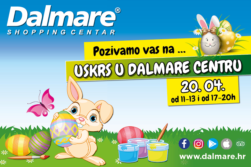 Kako bi u potpunosti doživjeli čari Uskrsa, u subotu, 20. travnja poklanjamo vam «Uskrs u Dalmare centru» od 11 do 13 sati te od 17 do 20 sati. Očekuje vas neumorni zeko s nezaobilaznim kreativnim radionicama, velikom potragom za pisanicama i raznim igrama, a koliko ste sretne ruke možete provjeriti na velikom uskrsnom bingu. Nagrade ne smijemo otkriti kaže zeko, zato skoknite, hop-hop, do Dalmarea i dočekajte Uskrs na pravom mjestu s pravom ekipom.