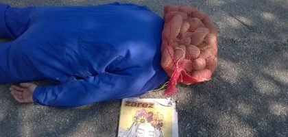 Mrtav čovjek u plavoj radničkom kombinezonu leži na asfaltu, a umjesto glave ima vreću krumpira. Pored njega na podu Zarez, tiskane novine, dvotjednik za kulturna i društvena zbivanja…